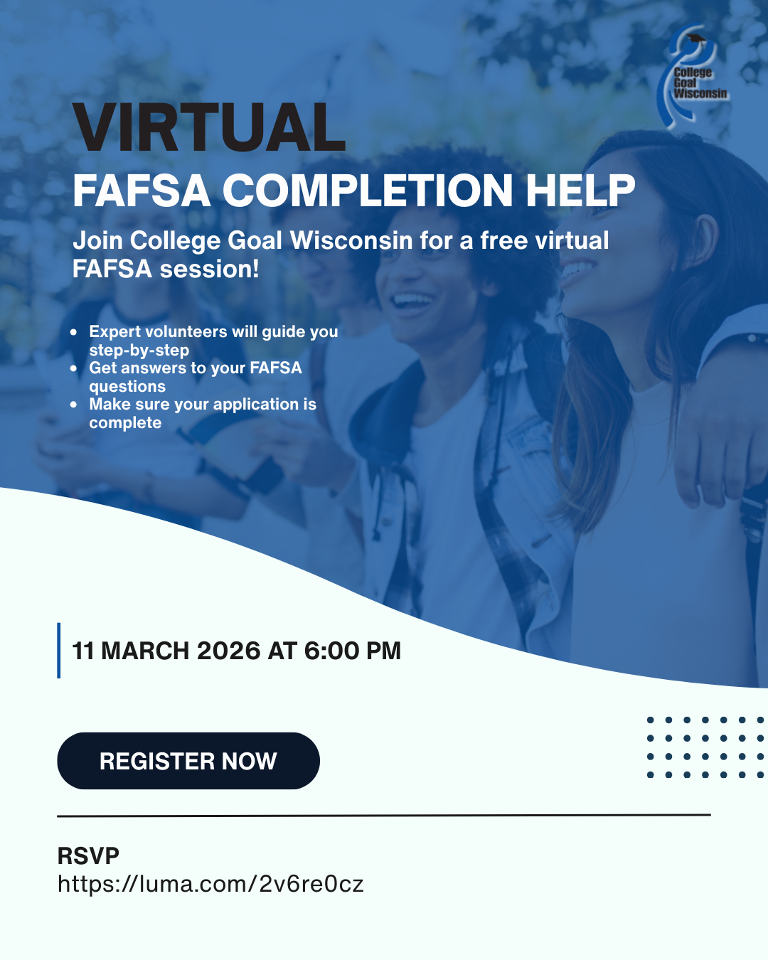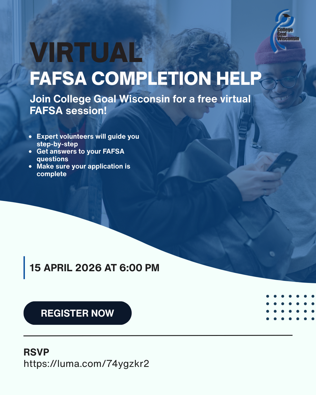 Join College Goal Wisconsin for free virtual FAFSA help sessions! Expert volunteers will guide you step-by-step, answer your questions, and make sure your FAFSA is complete.