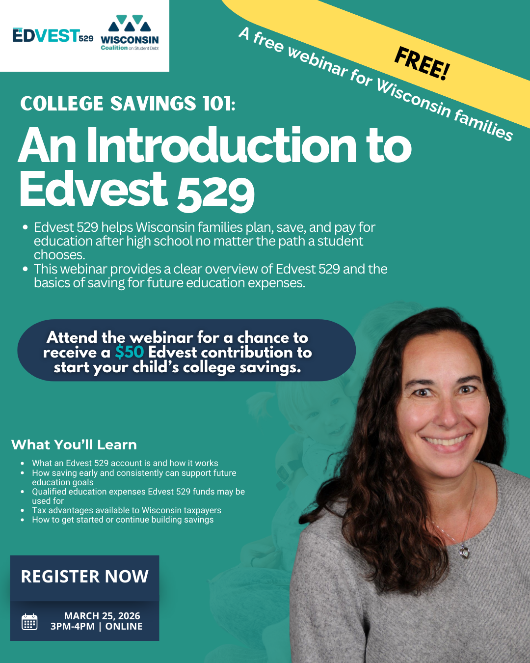 Join our free educational webinar for Wisconsin families and get clear, practical guidance on college planning and savings options. Learn how Edvest 529 can help your family save for the future — no sales, just straightforward information.